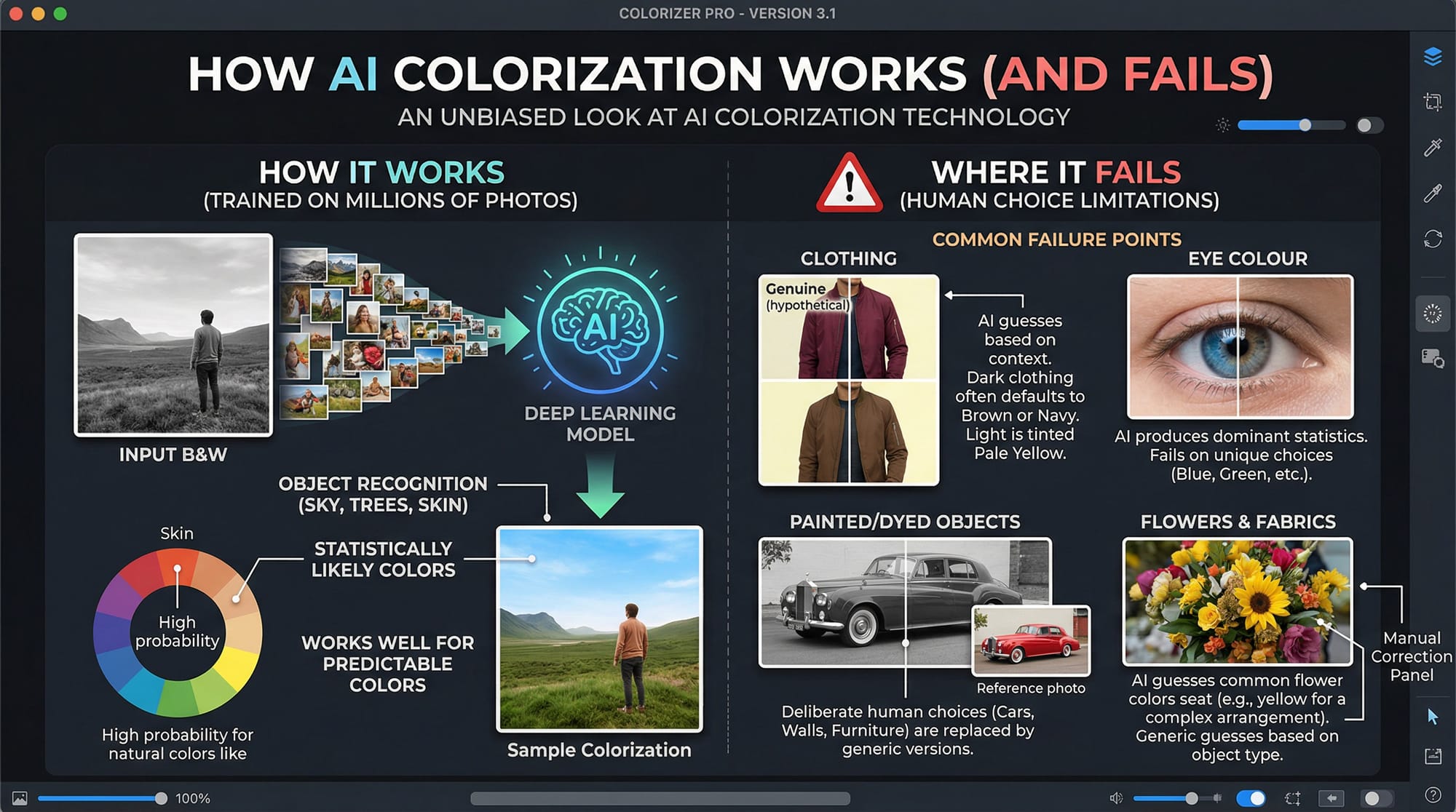 AI colorization tools are trained on millions of photographs. They recognize objects in the image — sky, grass, skin, wood — and assign statistically likely colours based on what those things usually look like. This works well for things with predictable colours: blue sky, green foliage, warm skin tones, brown wood. It fails on anything where colour was a human choice: clothing, painted walls, eye colour, vehicles, specific fabrics.