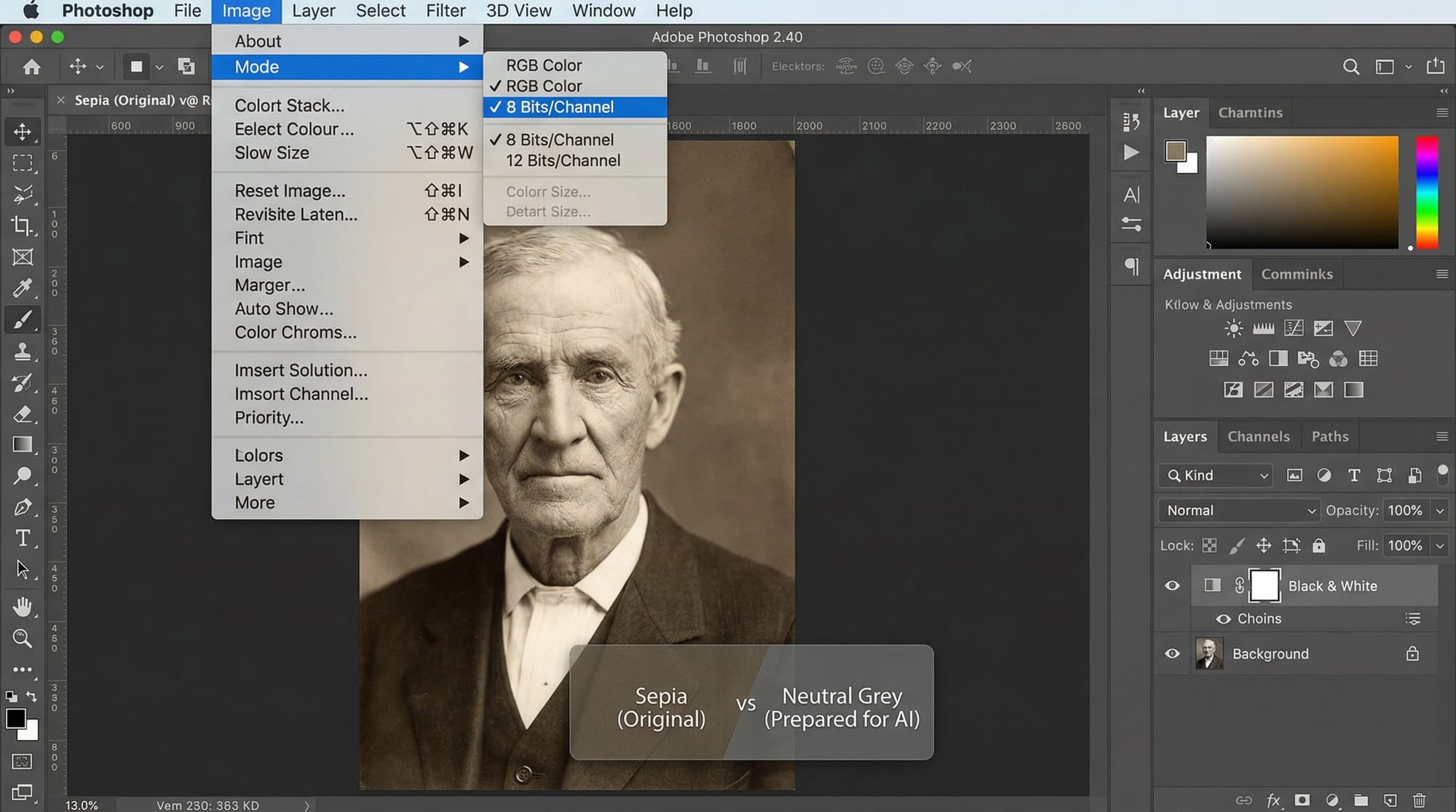 Step 1 — Prepare the image. Convert to RGB: Image → Mode → RGB Color. The Colorize filter only works in RGB 8-bit mode. If the photo is sepia-toned, add a Black and White adjustment layer first to neutralize the warm tint — AI performs better on neutral grey than on sepia.