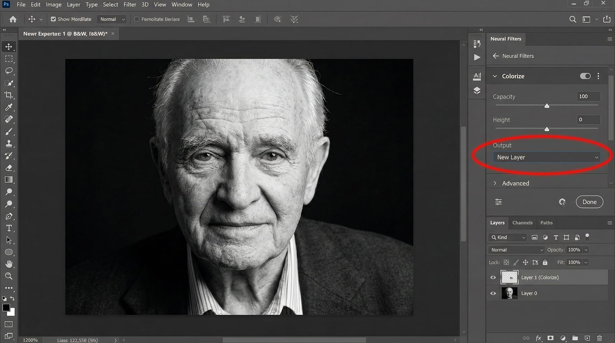 Step 4 — Output to a new layer. In the Output dropdown, choose New Layer. This keeps the original intact and lets you reduce opacity or mask the colorization layer selectively.