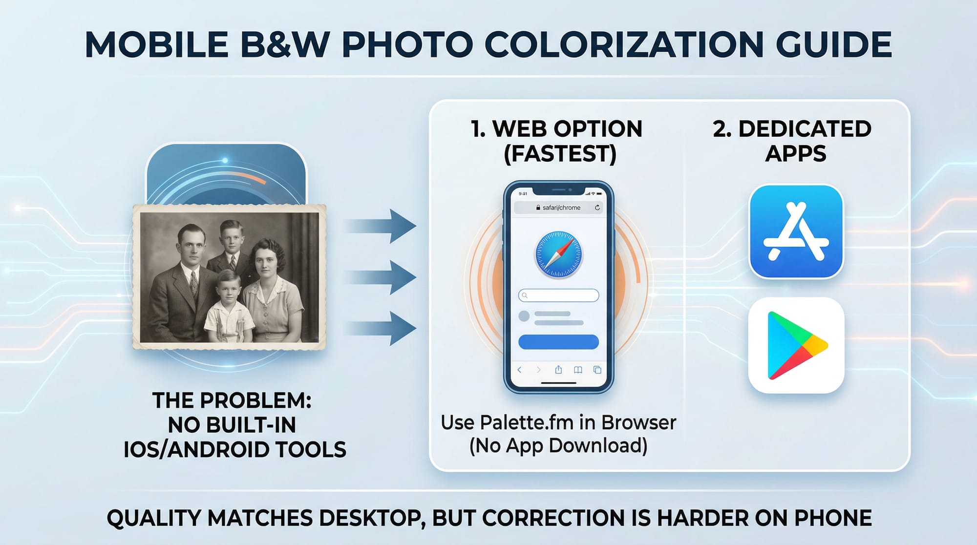No built-in iOS or Android photo app includes colorization. The fastest mobile option is Palette.fm in a mobile browser — works the same as desktop without an app download.
