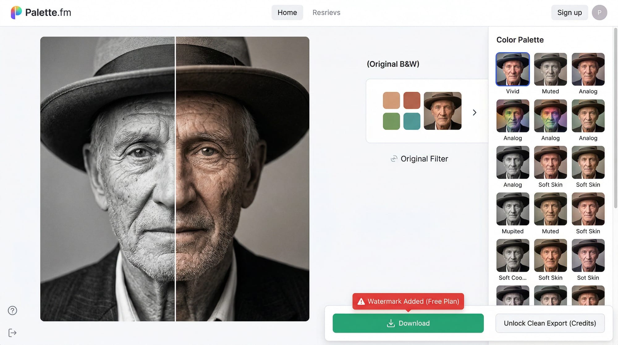Palette.fm — reliable results on skin tones and natural environments. Upload, choose a colour style from 21 filter options, preview. The free version now adds a watermark to downloads — for a clean export you'll need a paid plan or credits. Worth testing first: unlimited free previews let you see the result before committing. Good starting point for any portrait or historical photo.