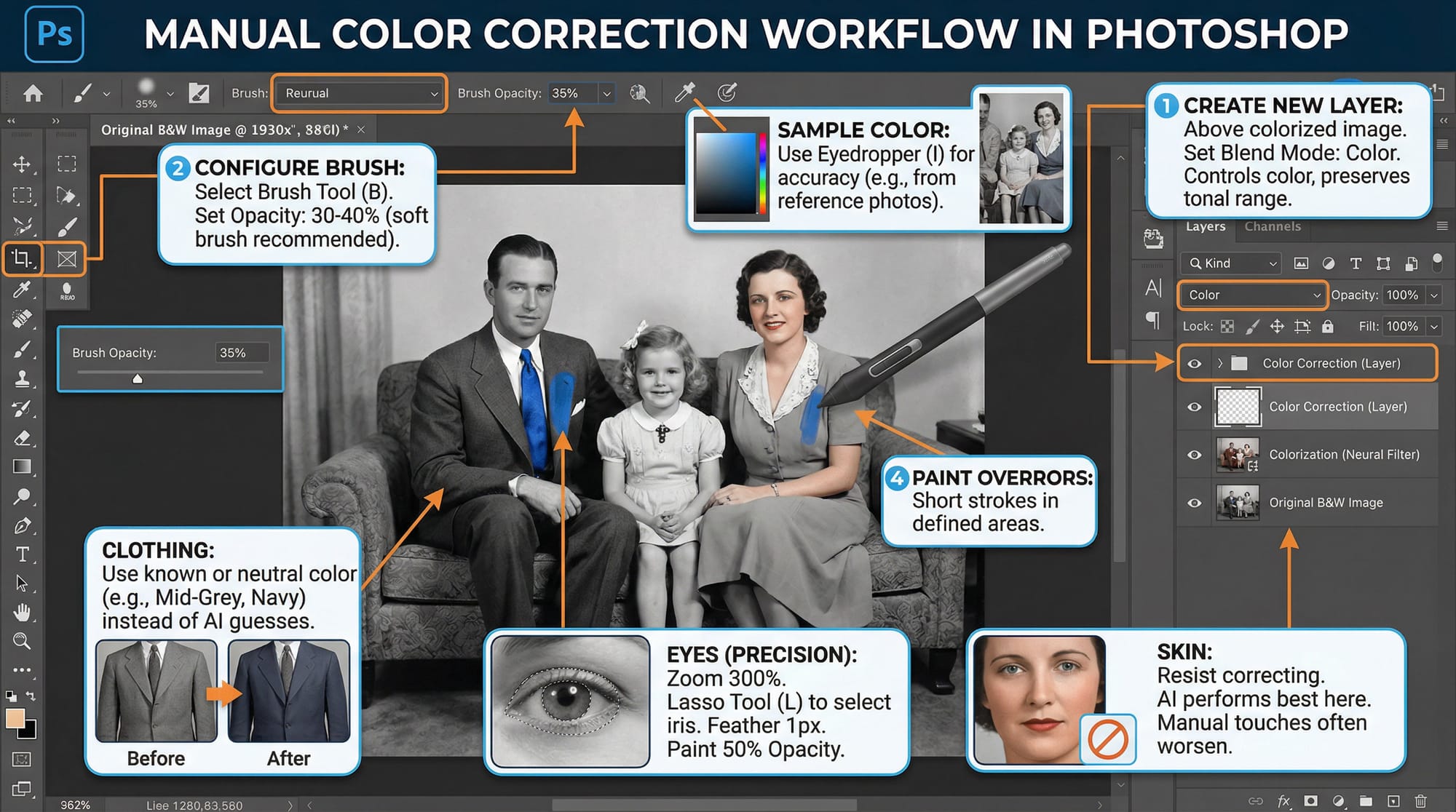 After running any AI colorization — from Photoshop's Neural Filter or an online tool imported back into Photoshop — this is the correction workflow: