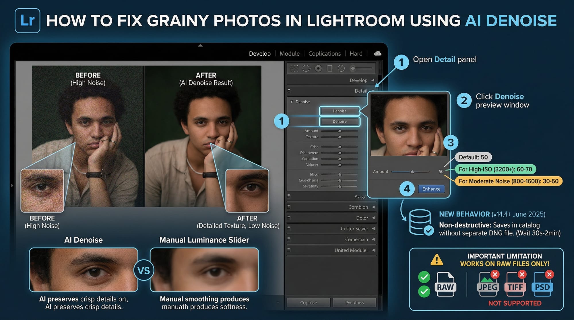 AI Denoise preserves texture far better than the manual Luminance slider. It distinguishes between noise and real detail in a way the old manual approach can't. I use it on every high-ISO RAW file now. The limitation: it only works on RAW files. JPEG, TIFF, and PSD files don't get the Denoise button.