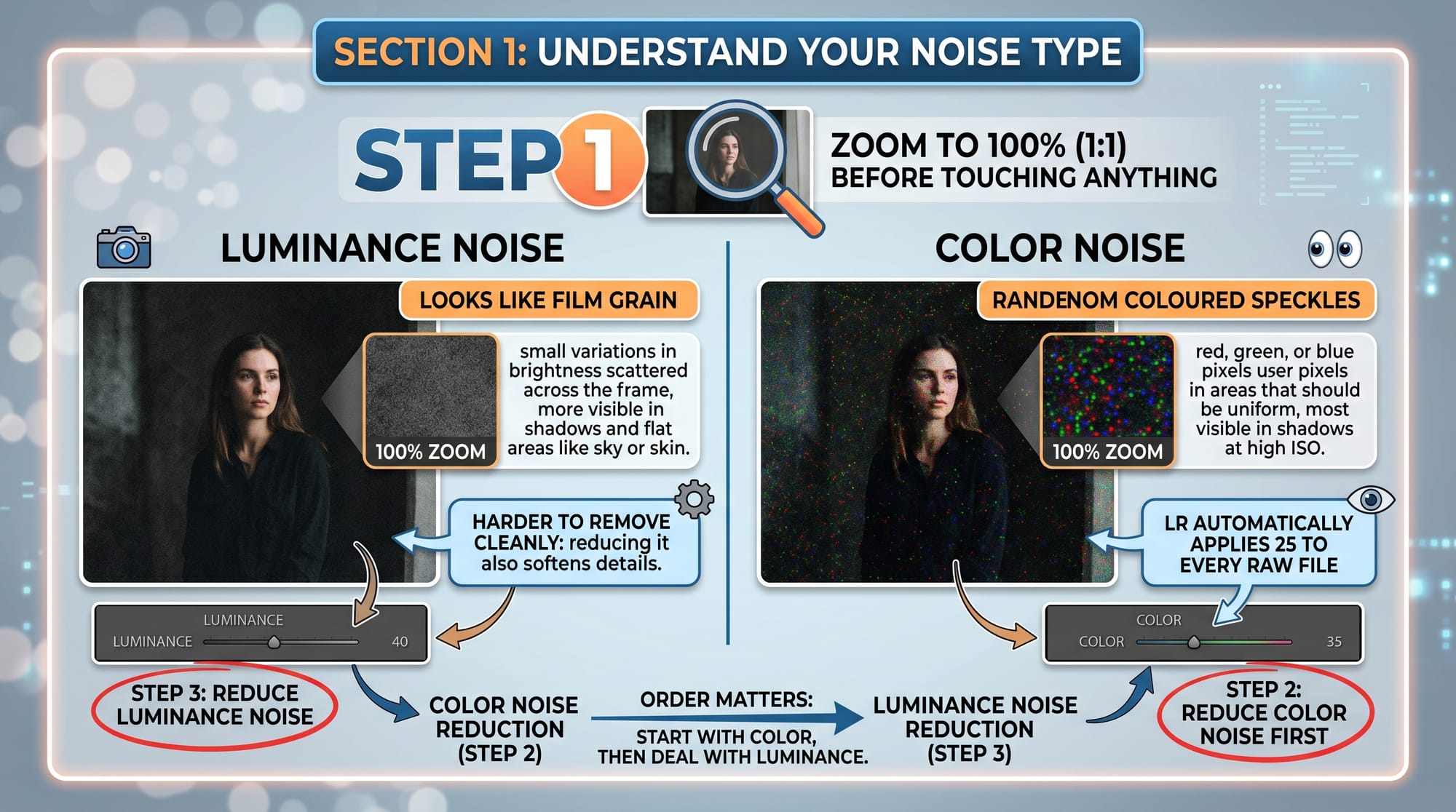 Zoom to 100% before touching anything. Noise looks different depending on its cause, and the fix differs accordingly.