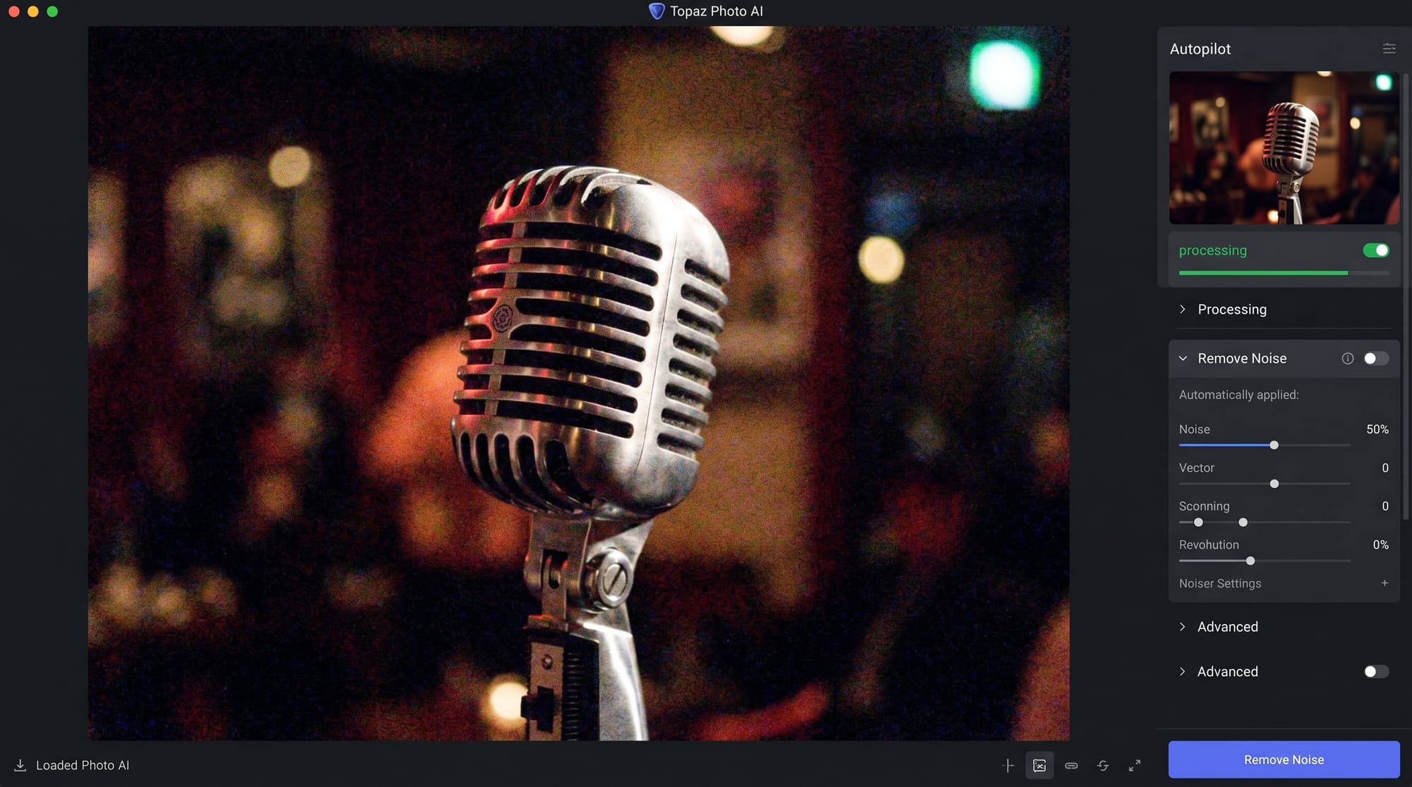 Open your image in Topaz Photo. Let Autopilot run first — it selects the model and strength automatically based on the image content. On most noisy shots it gets it right.
