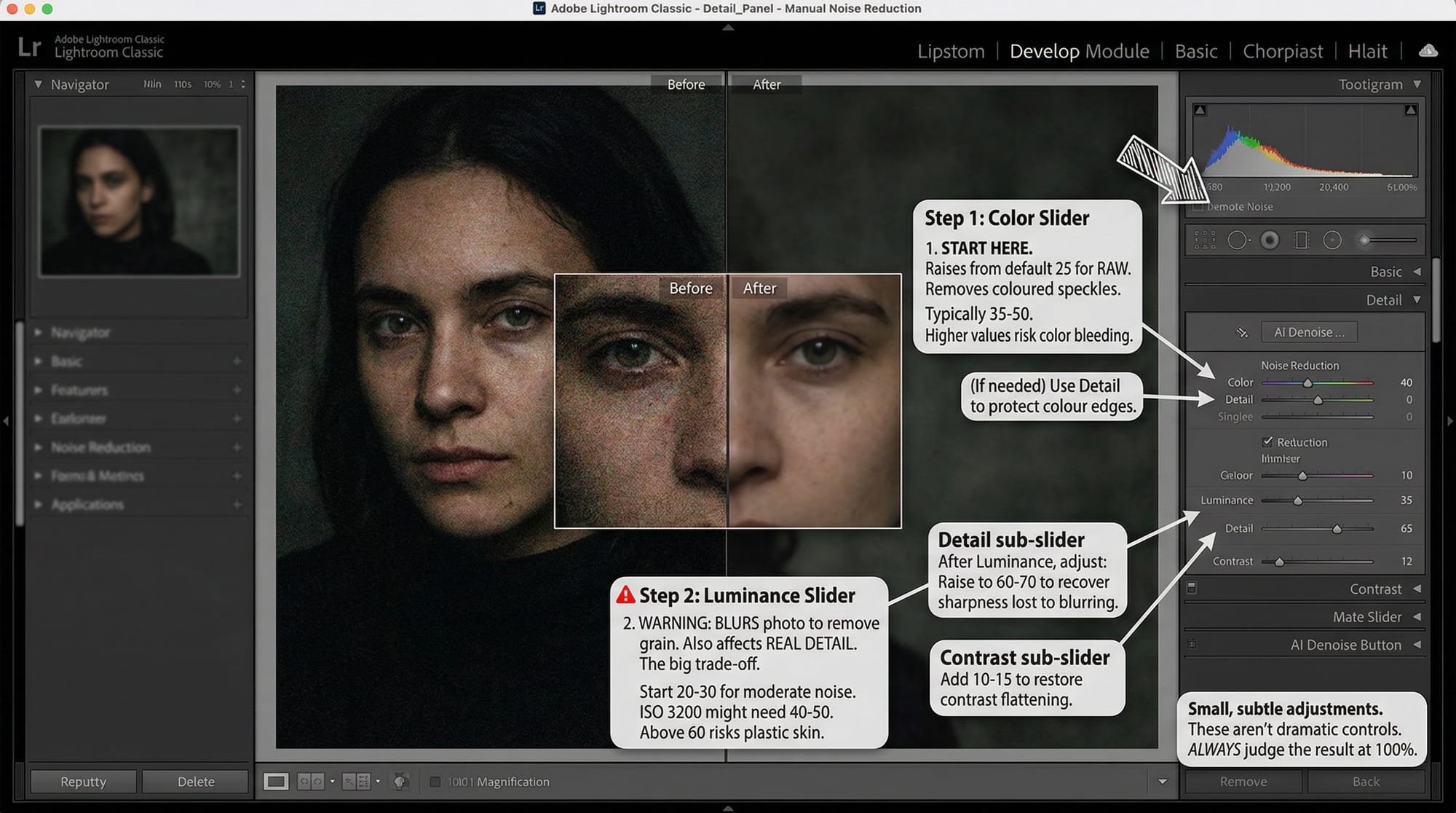 Luminance slider: This is set to 0 by default for a reason — moving it right blurs the photo to remove grain, and the blurring affects real detail as well as noise. There's no way around this trade-off with manual sliders. Start at 20–30 for moderate noise. ISO 3200 might need 40–50. Above 60, skin and fine textures start looking plastic.