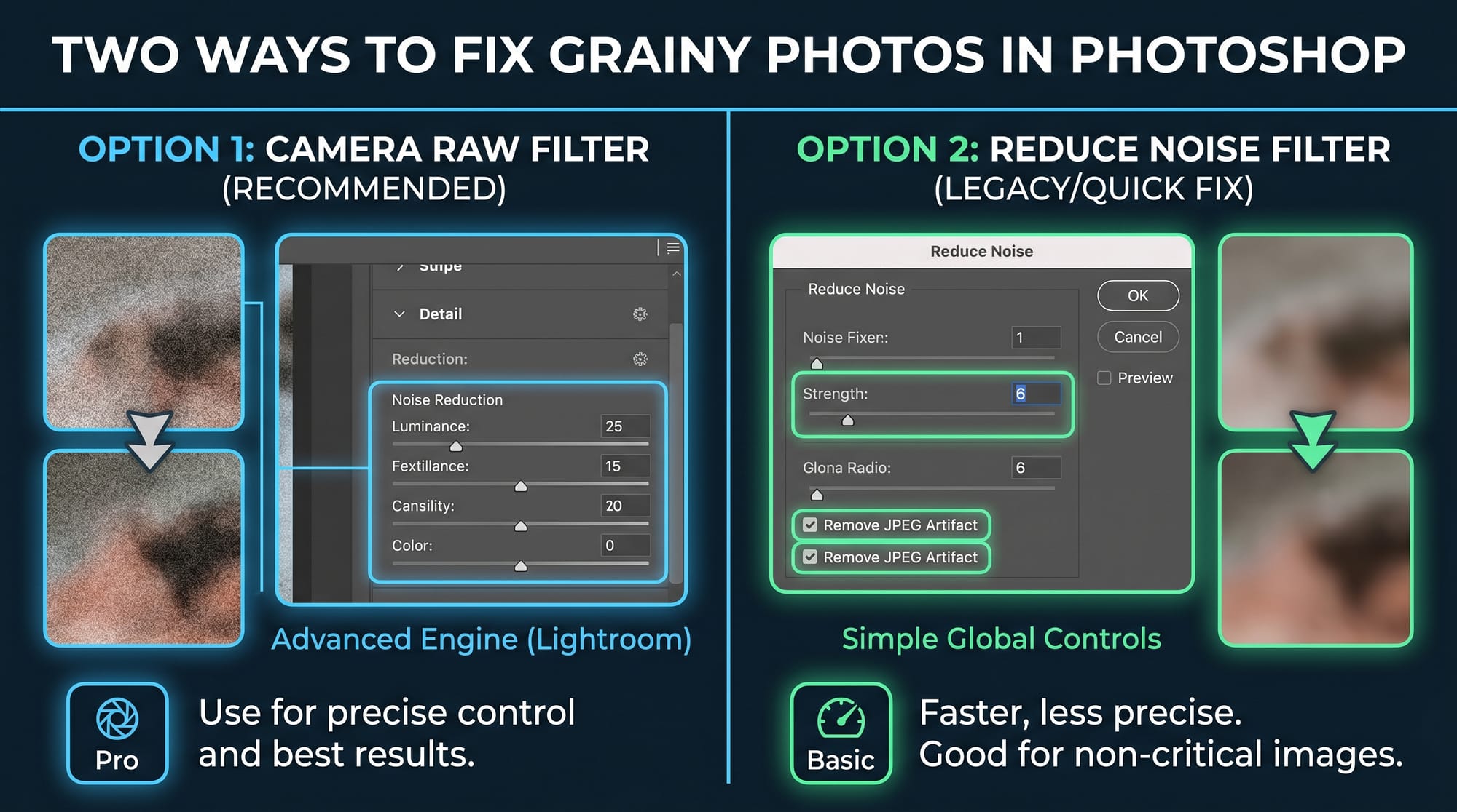 For portraits where you want noise reduction in the background but preserved skin detail: apply Camera Raw Filter globally first, add a layer mask, and paint black over the face and hair areas to restore the original sharpness there. Ten extra minutes but it makes a visible difference on close-up portraits. If the photo is also soft or blurry alongside the grain, deal with sharpening after noise reduction — the guide on fixing blurry photos covers which Lightroom and Topaz models to reach for.