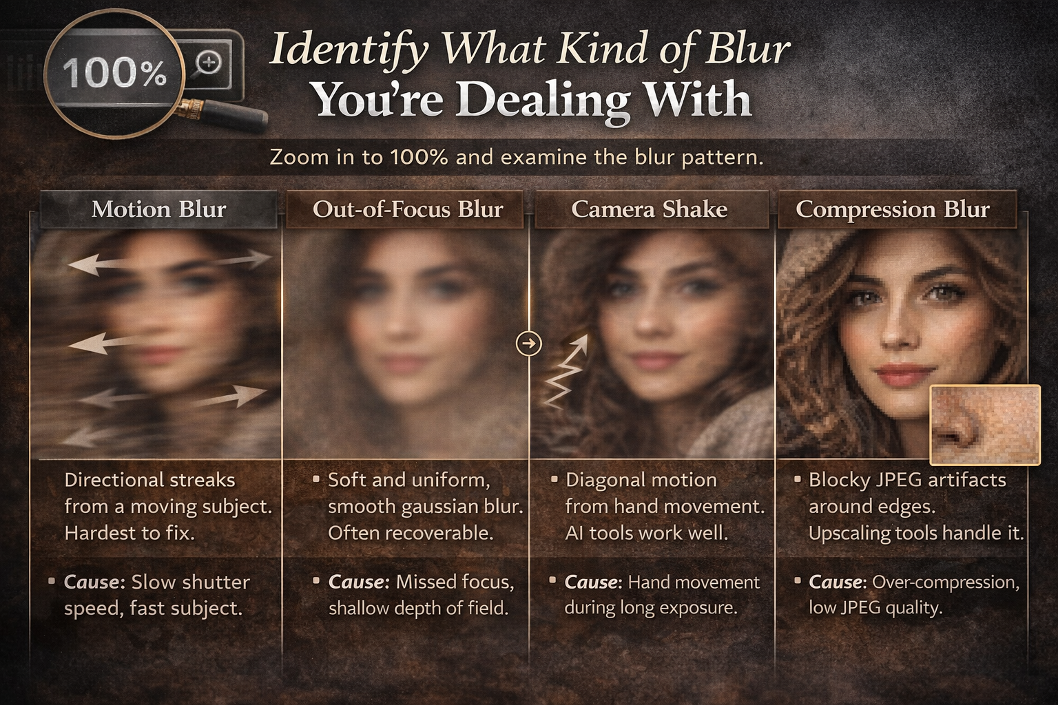 Out-of-focus blur is soft and uniform — no streaks, just a smooth gaussian softness. Often recoverable, especially with AI tools. Happens when autofocus locks on the wrong thing or depth of field is too shallow.