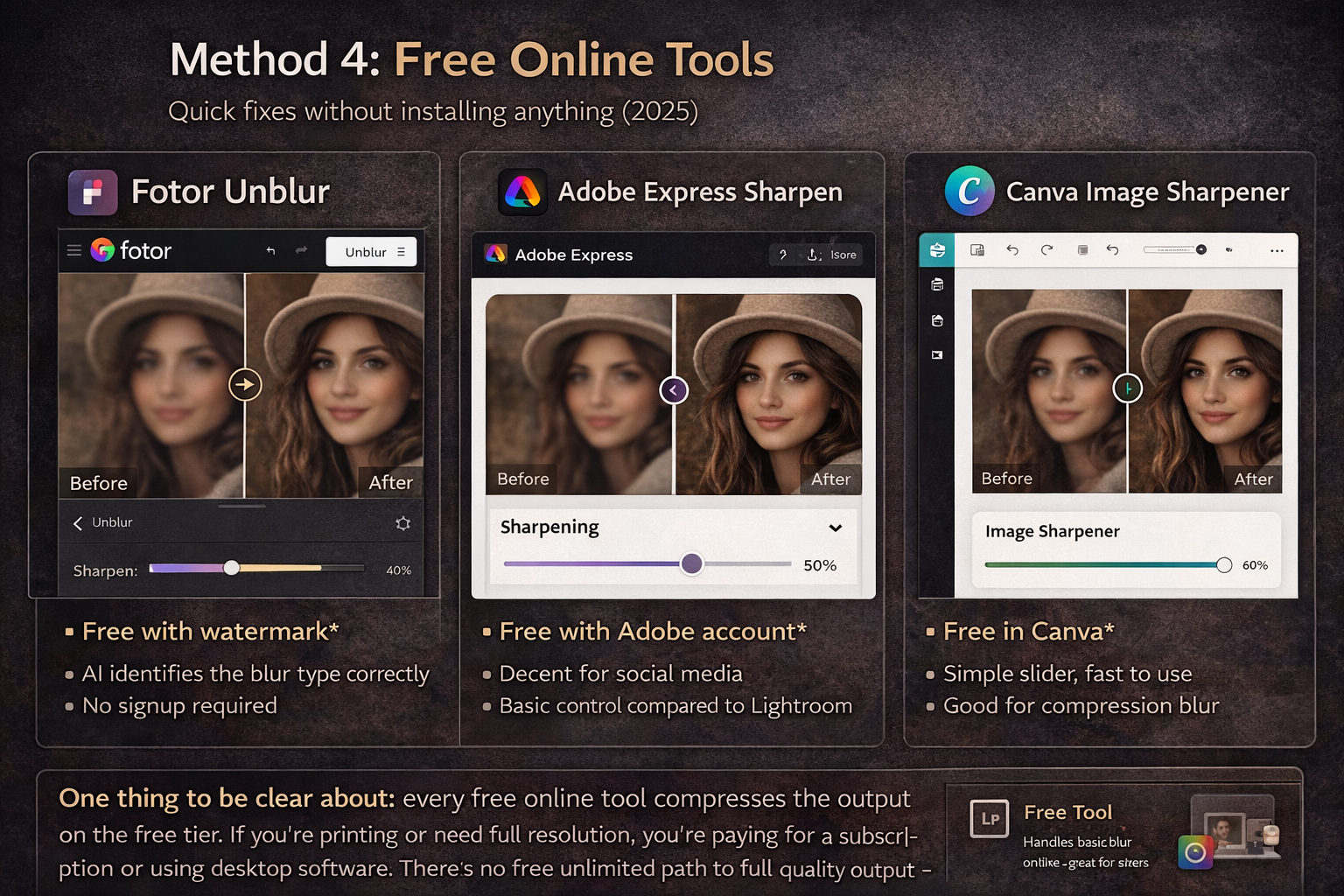- Adobe Express Sharpen — free with an Adobe account, decent for quick social media fixes. Limited control compared to Lightroom.
