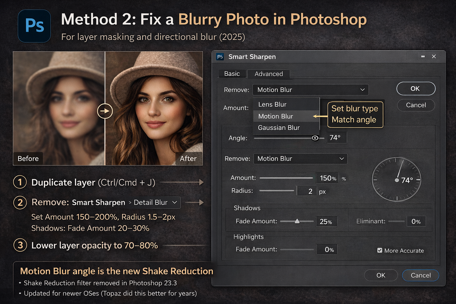 Worth knowing: Adobe removed the old Shake Reduction filter (Filter → Sharpen → Shake Reduction) in Photoshop 23.3 — it became incompatible with newer operating systems. Most tutorials still reference it. Shake Reduction is gone; Smart Sharpen with Motion Blur angle is now the native approach. And honestly, Topaz was doing this better for three years before Adobe pulled the filter anyway.