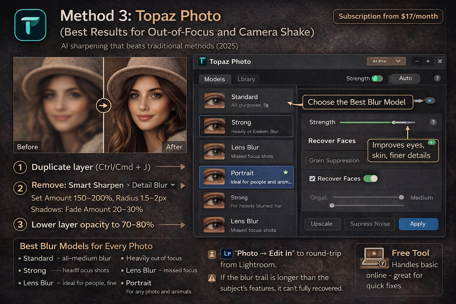 For photographers who regularly shoot portraits, events, or anything in challenging light — yes. The Portrait model and Recover Faces feature produce results that aren't possible in Lightroom alone. For occasional fixes, the free web tool at topazlabs.com handles basic blur without a subscription. The desktop app starts at $17/month and includes all models including Wildlife and the newer Portrait model.