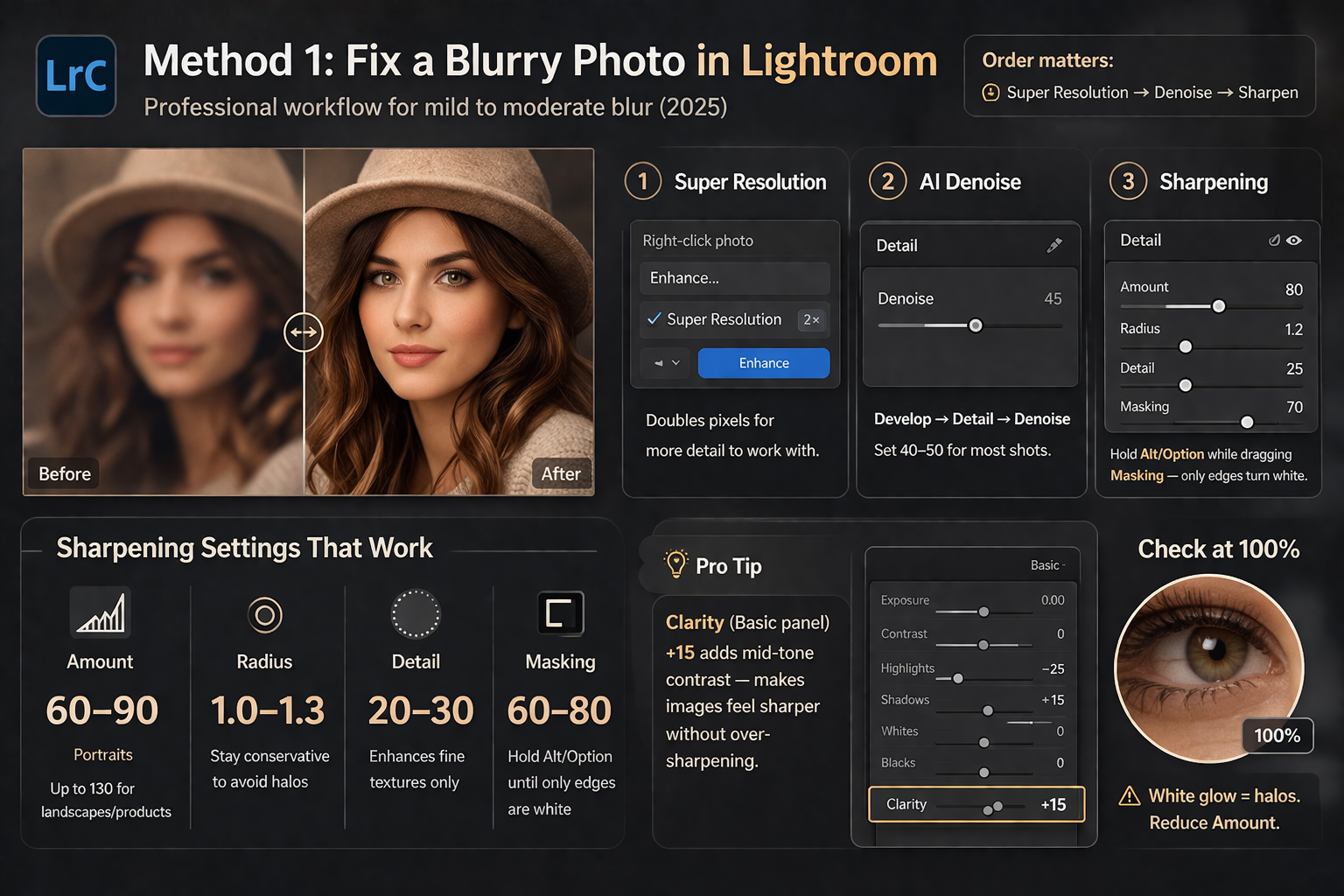 | Mild out-of-focus | Lightroom Detail panel | ✓ Good — often looks natural |