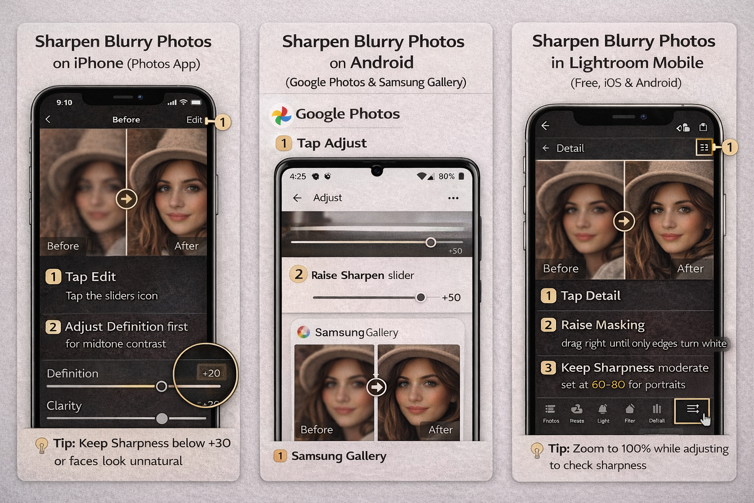 On iPhone: Photos → Edit → Definition slider first, then Sharpness — stay below +30. On Android: Google Photos → Edit → Adjust → Sharpen, or Samsung Gallery's Remaster button for portraits. For the best mobile results: install Lightroom Mobile (free) and use its Detail panel — it has Masking support and matches desktop quality.