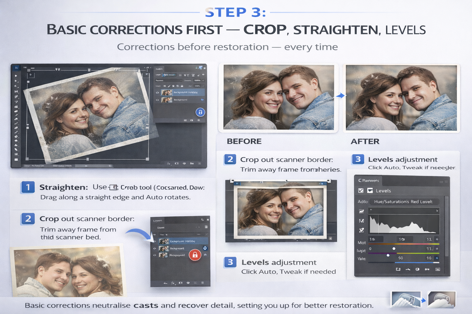 I've watched people spend an hour removing scratches on a washed-out scan, then find that the contrast correction afterwards shifted the whole tonal balance and half the healing work looked wrong. Corrections first, restoration second — every time.