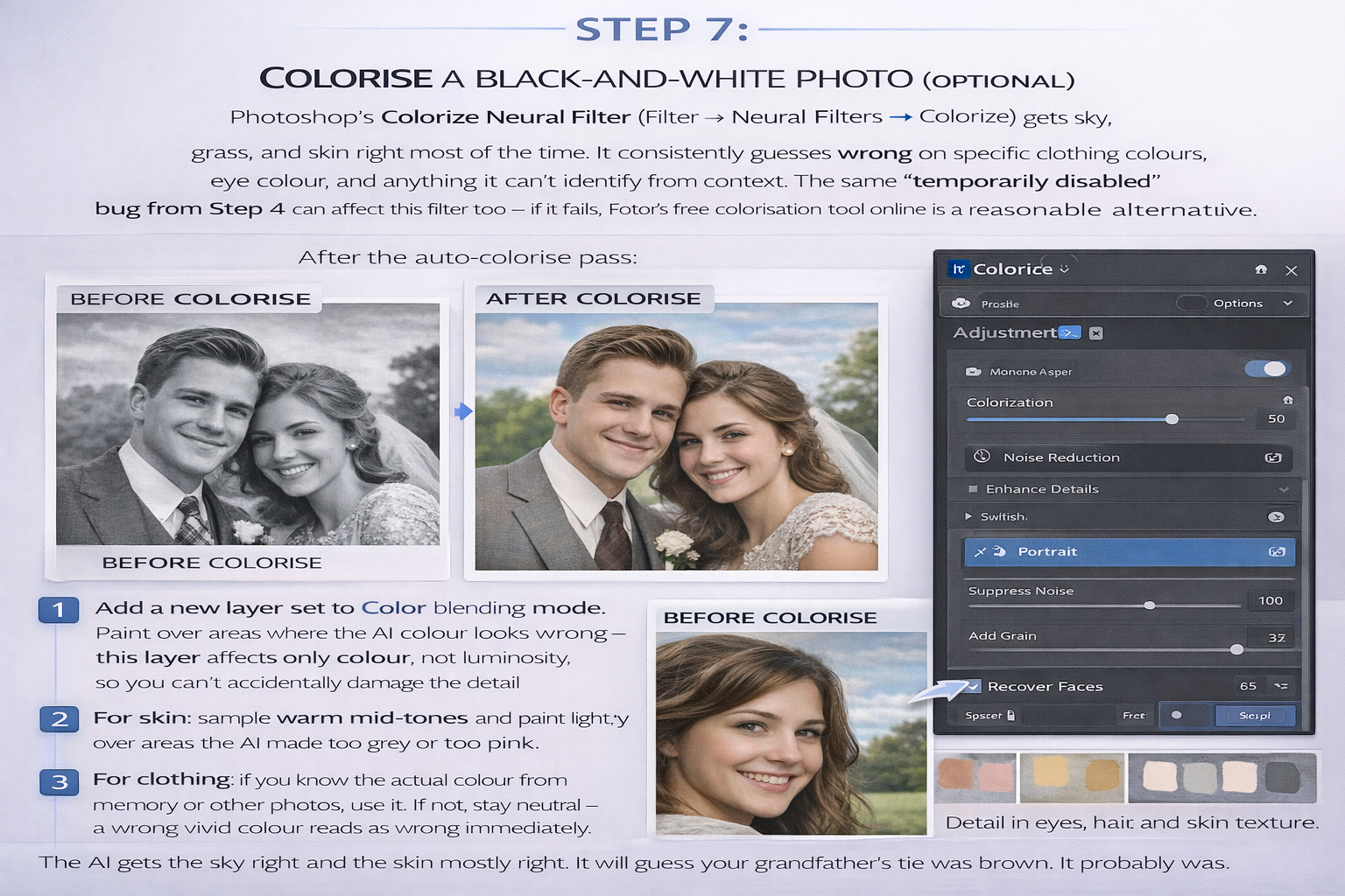 Photoshop's Colorize Neural Filter (Filter → Neural Filters → Colorize) gets sky, grass, and skin right most of the time. It consistently guesses wrong on specific clothing colours, eye colour, and anything it can't identify from context. The same "temporarily disabled" bug from Step 4 can affect this filter too — if it fails, Fotor's free colorisation tool online is a reasonable alternative.