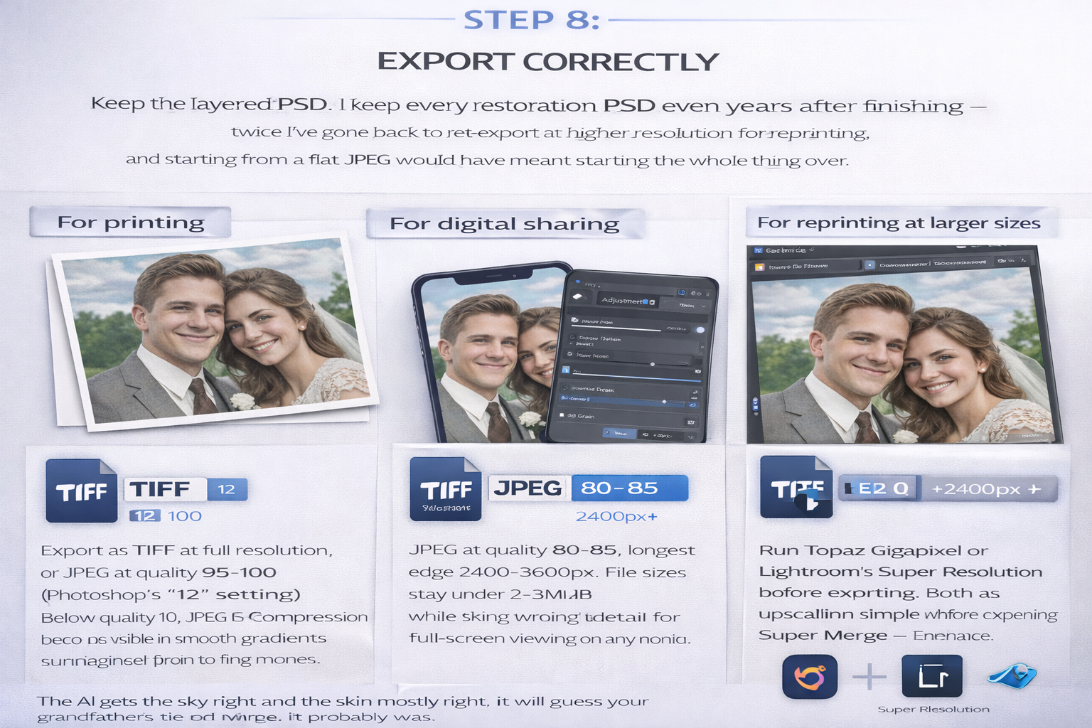 - For printing: Export as TIFF at full resolution, or JPEG at quality 95–100 (Photoshop's "12" setting). Below quality 10, JPEG compression becomes visible in smooth gradients and skin tones.