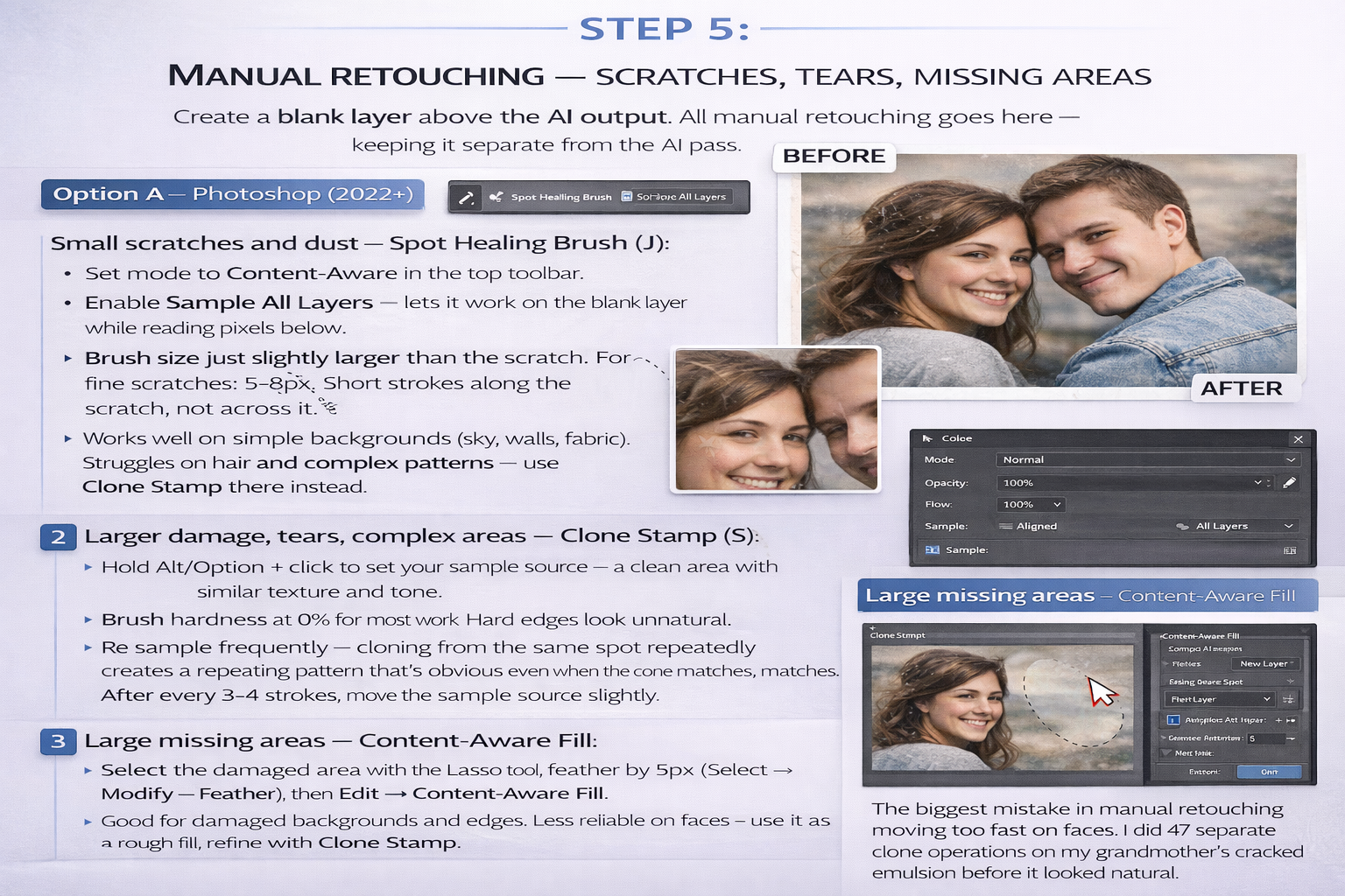 | Large missing sections | Content-Aware Fill + manual cleanup | ✗ Partial — AI invents, not recovers |