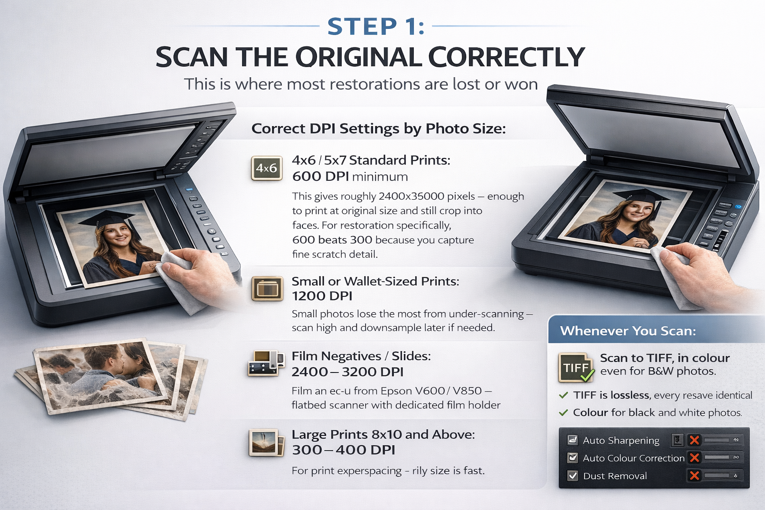 600 DPI for standard 4×6 and 5×7 prints. 1200 DPI for wallet-sized or smaller prints. Film negatives and slides: 2400–3200 DPI with a dedicated film scanner or flatbed with film attachment. Always scan to TIFF — lossless means no quality degradation on resaves. You can always downsample a 600 DPI scan; you can't add resolution back after scanning too low.