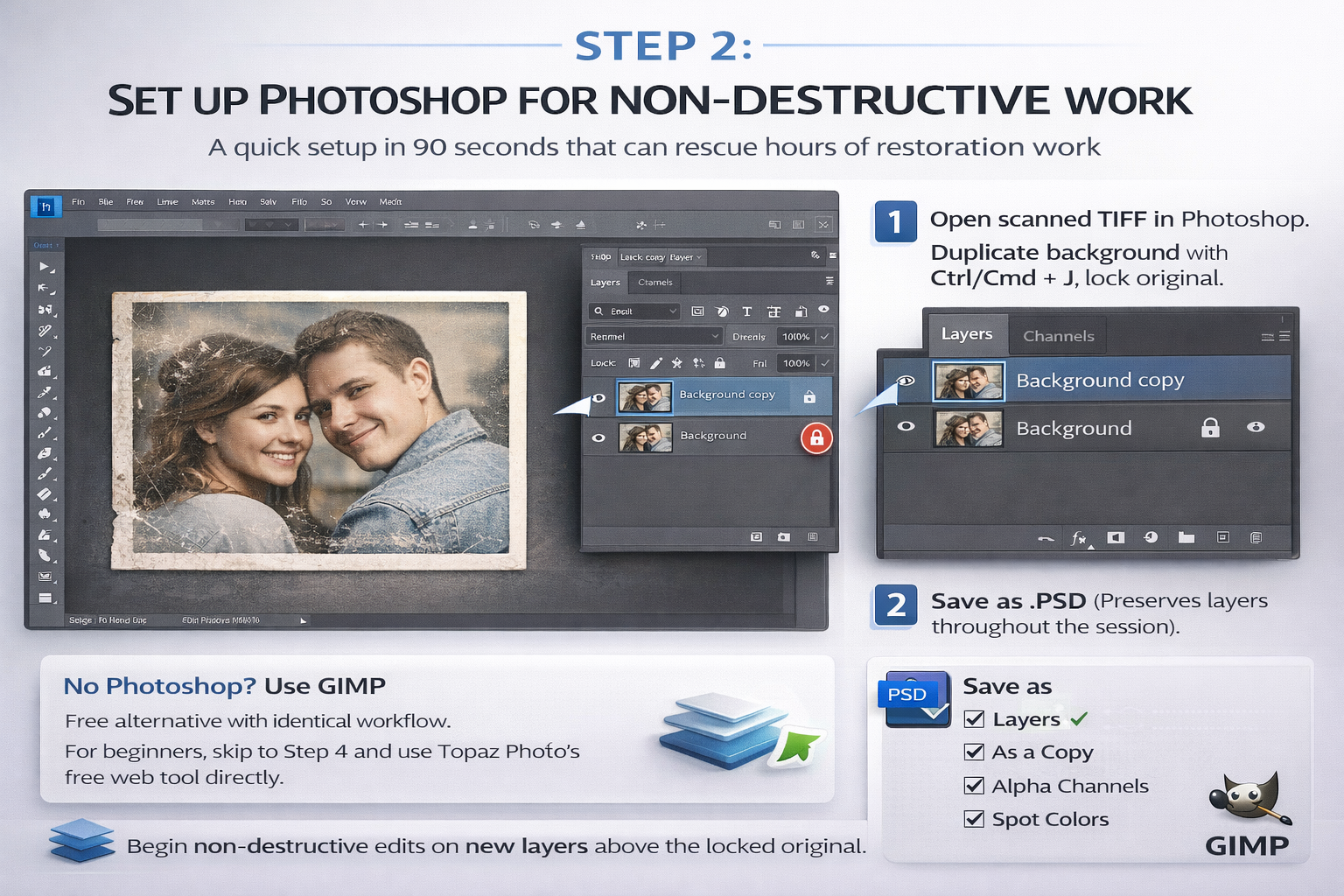 This step takes ninety seconds and has saved me from disaster more than once — I lost a full restoration session early on because I forgot to save as PSD before closing. The first Save As is muscle memory now.