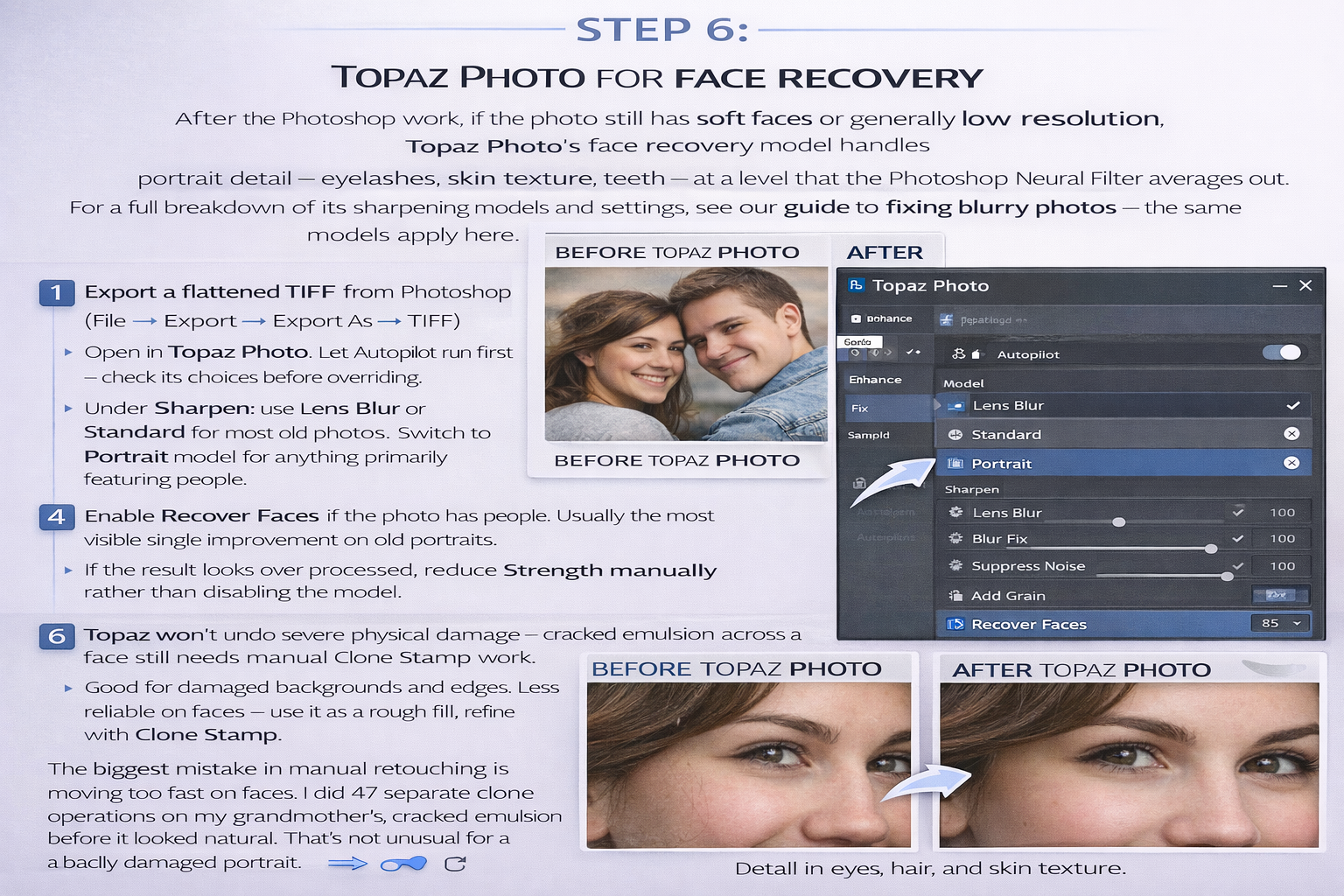 After the Photoshop work, if the photo still has soft faces or generally low resolution, Topaz Photo's face recovery model handles portrait detail — eyelashes, skin texture, teeth — at a level that the Photoshop Neural Filter averages out. For a full breakdown of its sharpening models and settings, see our guide to fixing blurry photos — the same models apply here.