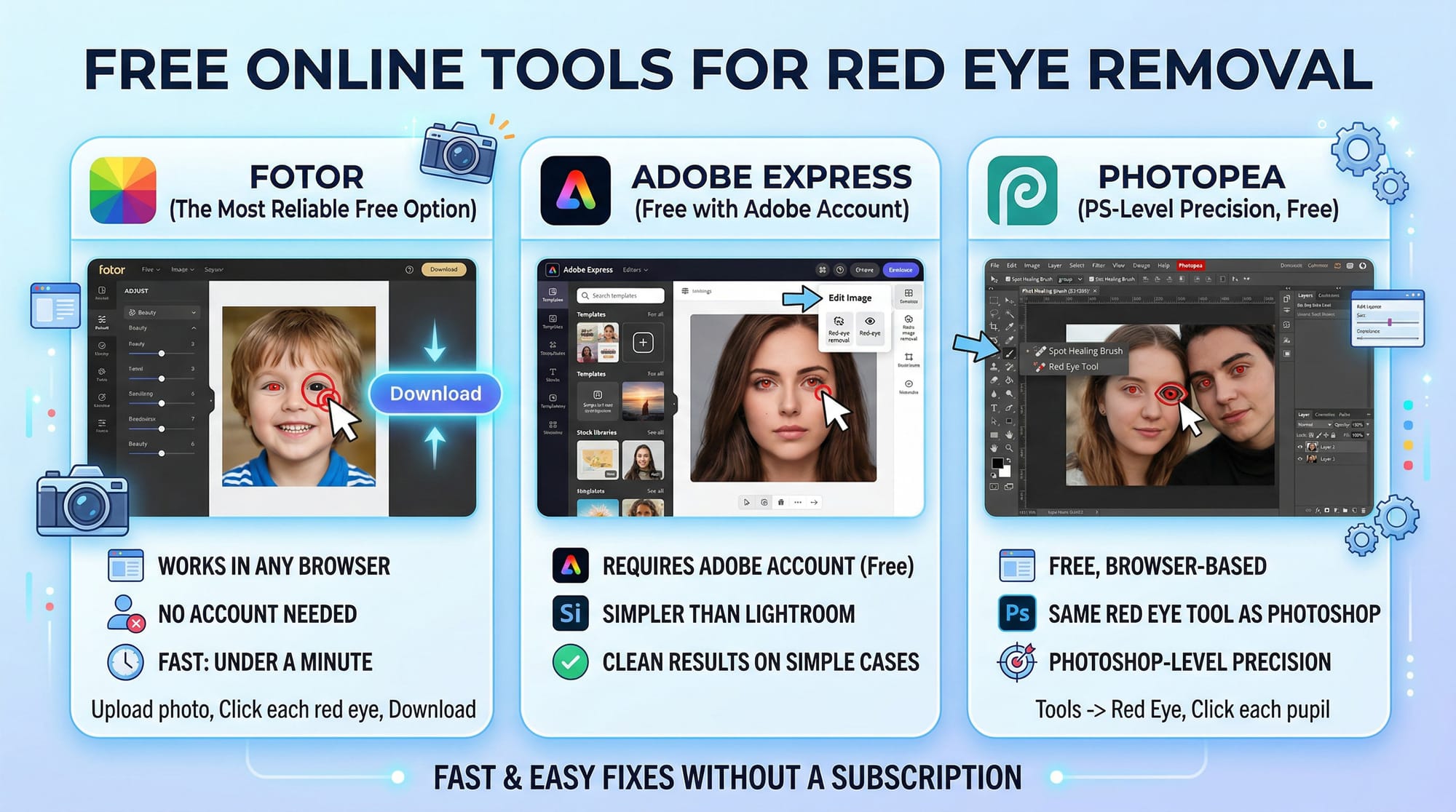 Fotor is the most reliable free option. Upload the photo, click each red eye, download. No account needed, works in any browser, handles most cases in under a minute.