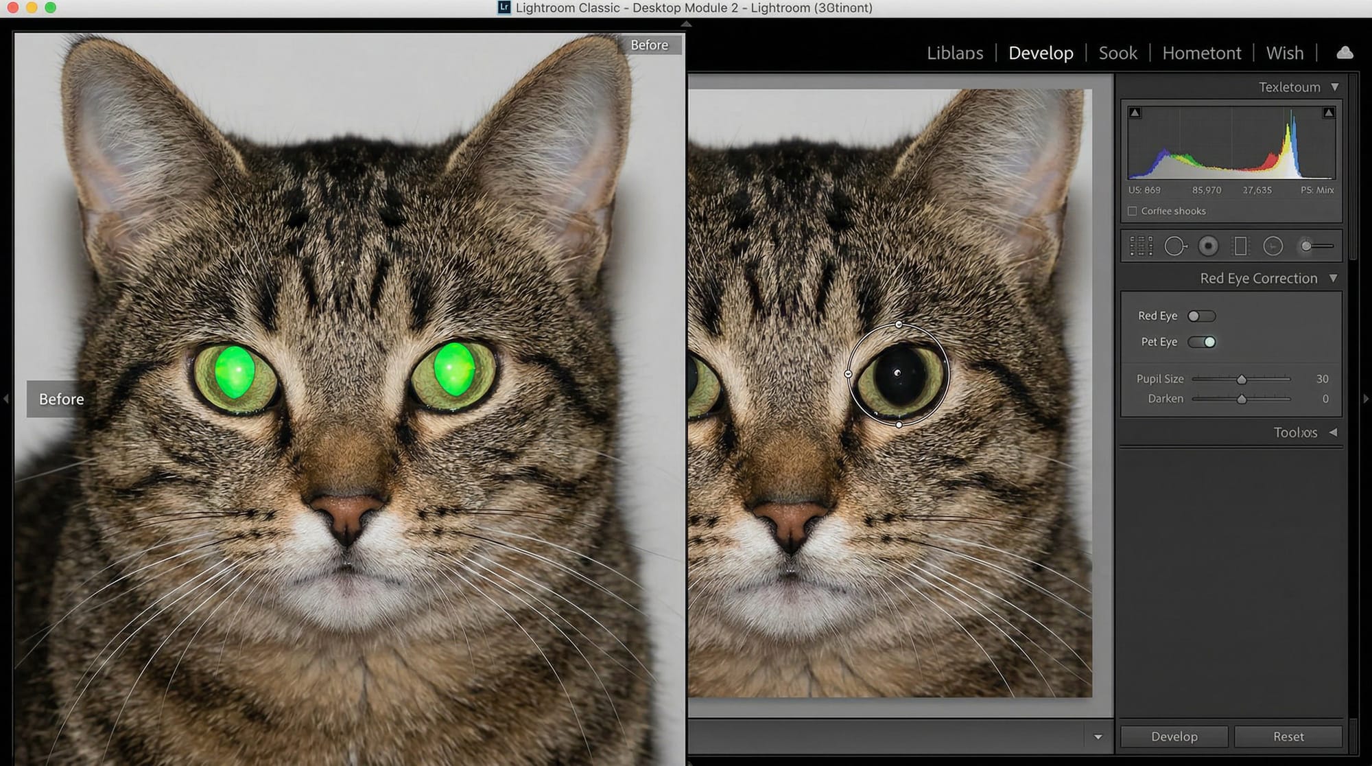 In Lightroom Classic: the Red Eye Correction tool has a Pet Eye option alongside Red Eye. Select it, draw the circle over the pet's eye, adjust the Pupil Size and Darken sliders. The Pet Eye mode detects green and yellow pixels instead of red. Works well on dogs and cats with a clearly defined pupil shape.