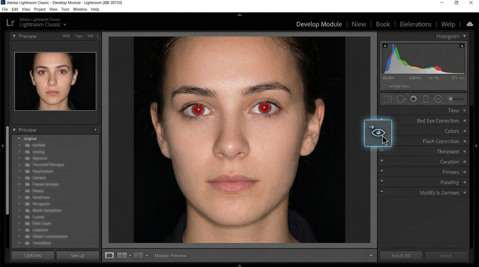 In the Develop module, look for the Red Eye Correction tool in the toolbar below the Histogram panel — it looks like an eye with an arrow. Click it.