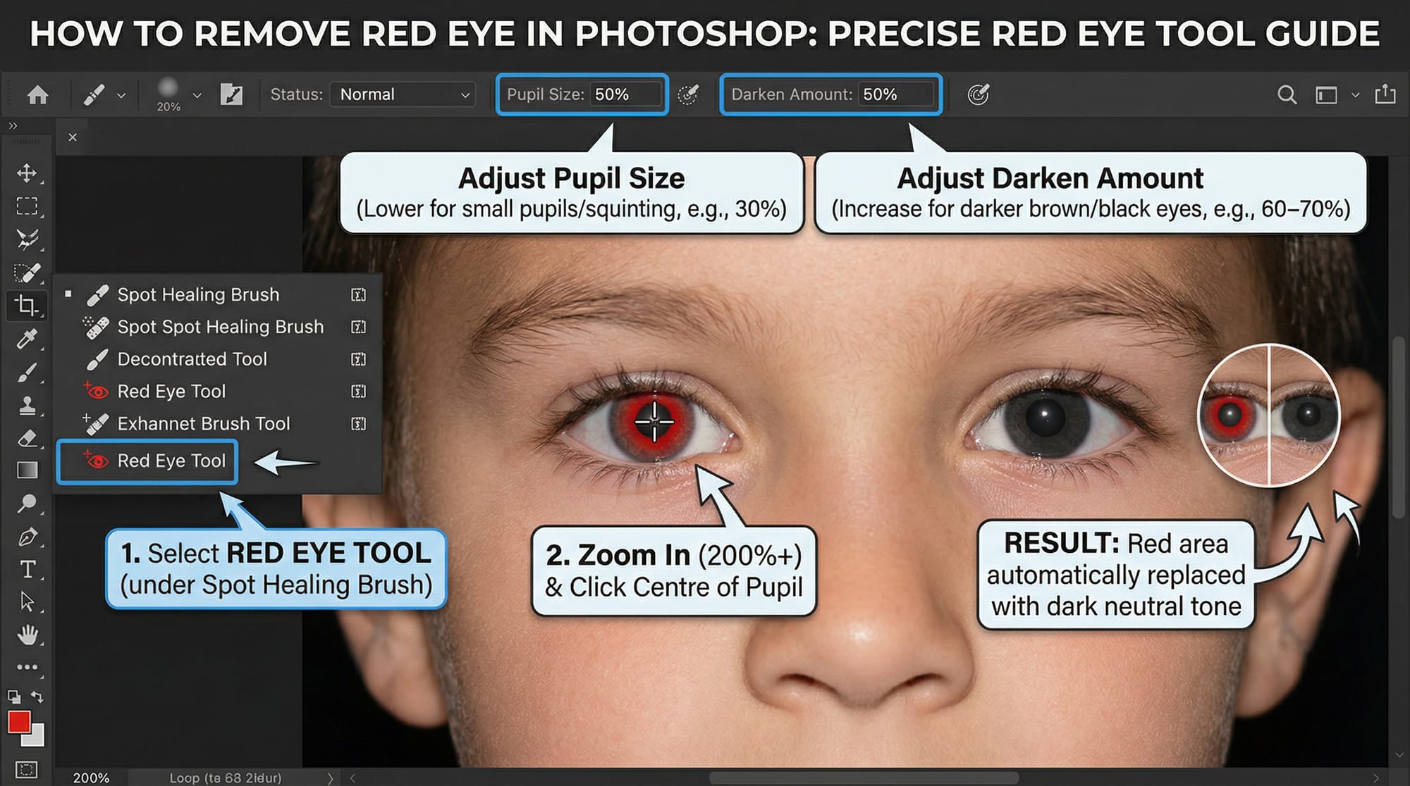 It's nested under the Spot Healing Brush in the left toolbar. Click and hold the Spot Healing Brush icon to reveal the flyout menu, then select Red Eye Tool at the bottom. Set Pupil Size and Darken Amount in the options bar — 50% for both works for most photos. Zoom to at least 100% before clicking, then click directly on the centre of the red pupil.