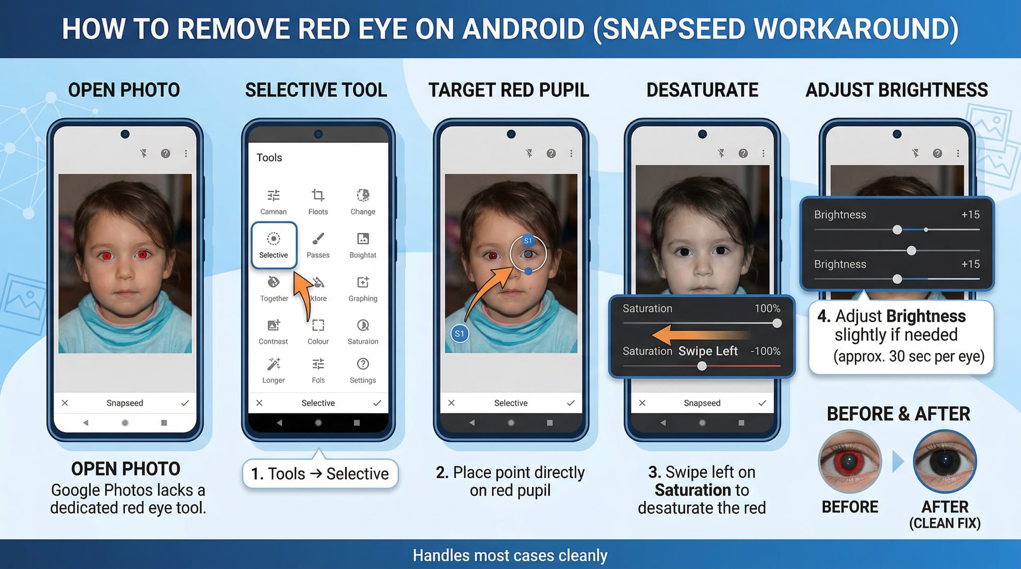 Google Photos doesn't have a dedicated red eye tool. The fastest workaround on Android: use Snapseed (free, Google). Open the photo → Tools → Selective → place a point directly on the red pupil → swipe left on Saturation to desaturate the red → adjust Brightness slightly if needed. About 30 seconds per eye and handles most cases cleanly.
