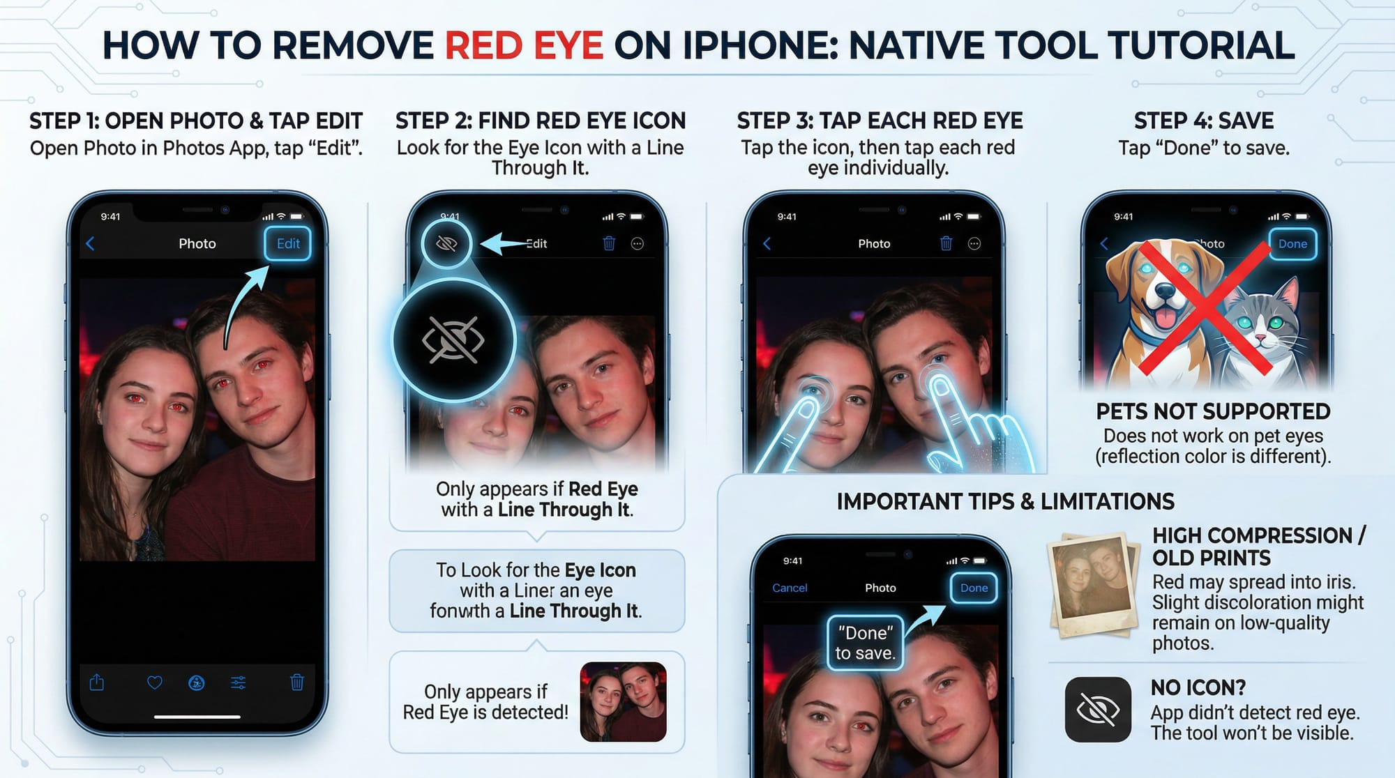 iPhone has a built-in red eye correction tool that many people don't know about. It's not in the main editing panel — it's a separate icon that only appears when the Photos app detects red eyes in the photo. If you open a photo and don't see the eye icon, it means the app didn't detect red eye automatically. Try tapping each eye area manually after activating the tool.